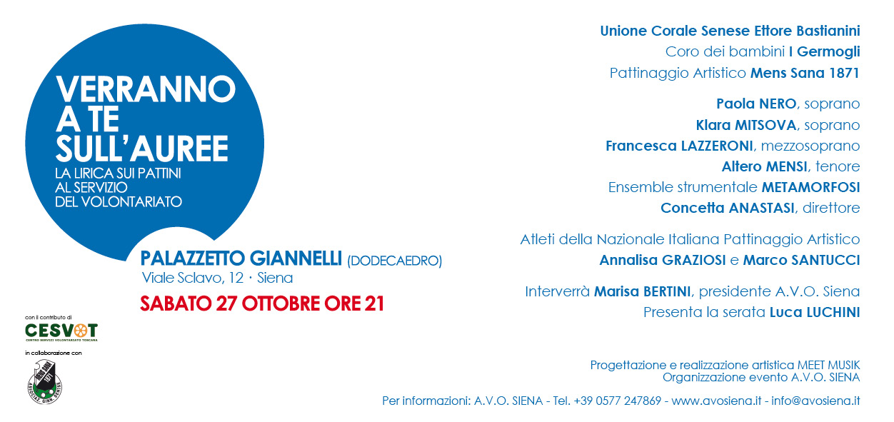 Grande successo di pubblico per lo spettacolo di Sabato 27 ottobre 2012 al Palazzetto Giannelli di Viale Sclavo dove si è tenuta una grande manifestazione per celebrare la Giornata AVO, in collobaborazione con la Mens Sana è stata organizzata una serata che ha coniugato la lirica con uno spettacolo sui pattini. All’evento hanno partecipato, per la parte lirica, la Corale Senese ed il coro dei bambini “I Germogli” nonchè la partecipazione di famosi solisti, mentre gli alteti della Sezione Pattinaggio Artistico della MensSana hanno fatto le loro evoluzioni sui pattini con l’intervento di due componenti della Nazionale Italiana Pattinaggio Artistico.