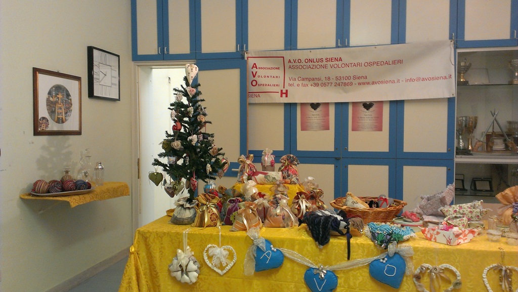 A fine mese di Ottobre e a fine del mese di Novembre si sono svolti 2 mercatini (Ospedale Le Scotte e Casa di Riposo Campansi) organizzati dalle volontarie A.V.O., che grazie alla loro capacità creativa ed alla qualità di quanto prodotto hanno avuto un GRANDISSIMO SUCCESSO sia per gli apprezzamenti ricevuti che per le somme raccolte.